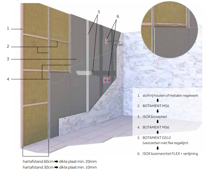 - Ne fixez pas d'objets directement dans le panneau de construction iSOX. Assurez-vous d'une structure portante, comme un panneau OSB, pour des objets lourds tels que des porte-manteaux ou des accessoires de douche.
