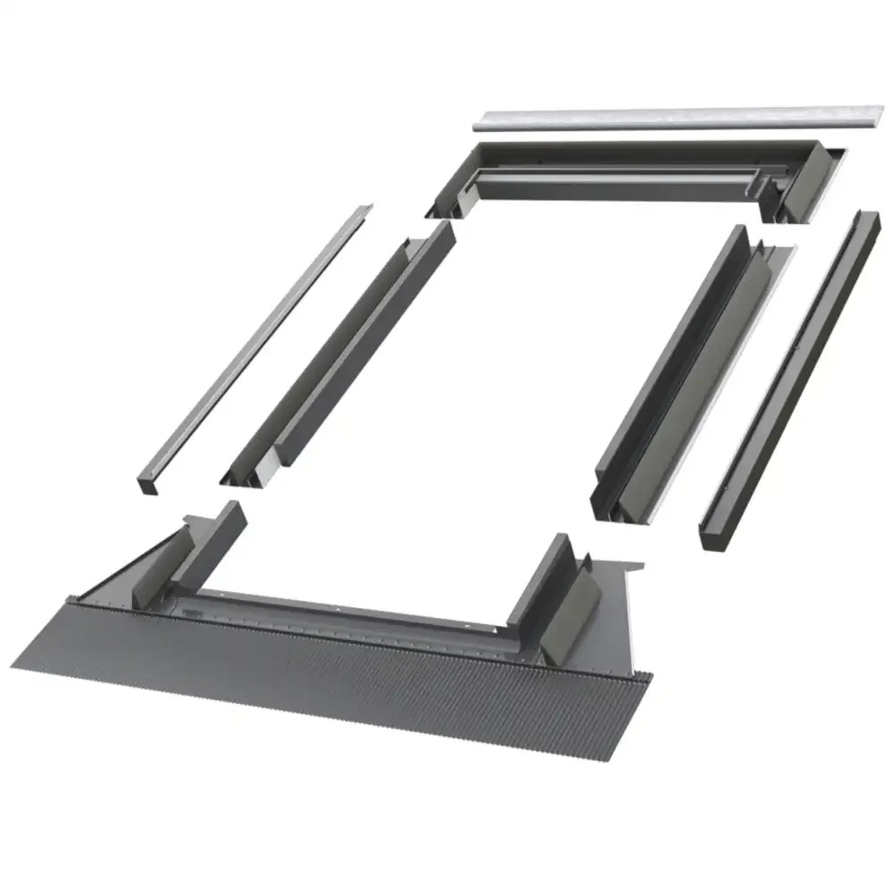 Le Fakro EHV-PT est un gouttière isolante supplémentaire pour couvertures de toit profilées avec bande de plomb de 21 cm (laquée RAL 7022) pour un raccord parfait et esthétique avec les tuiles.