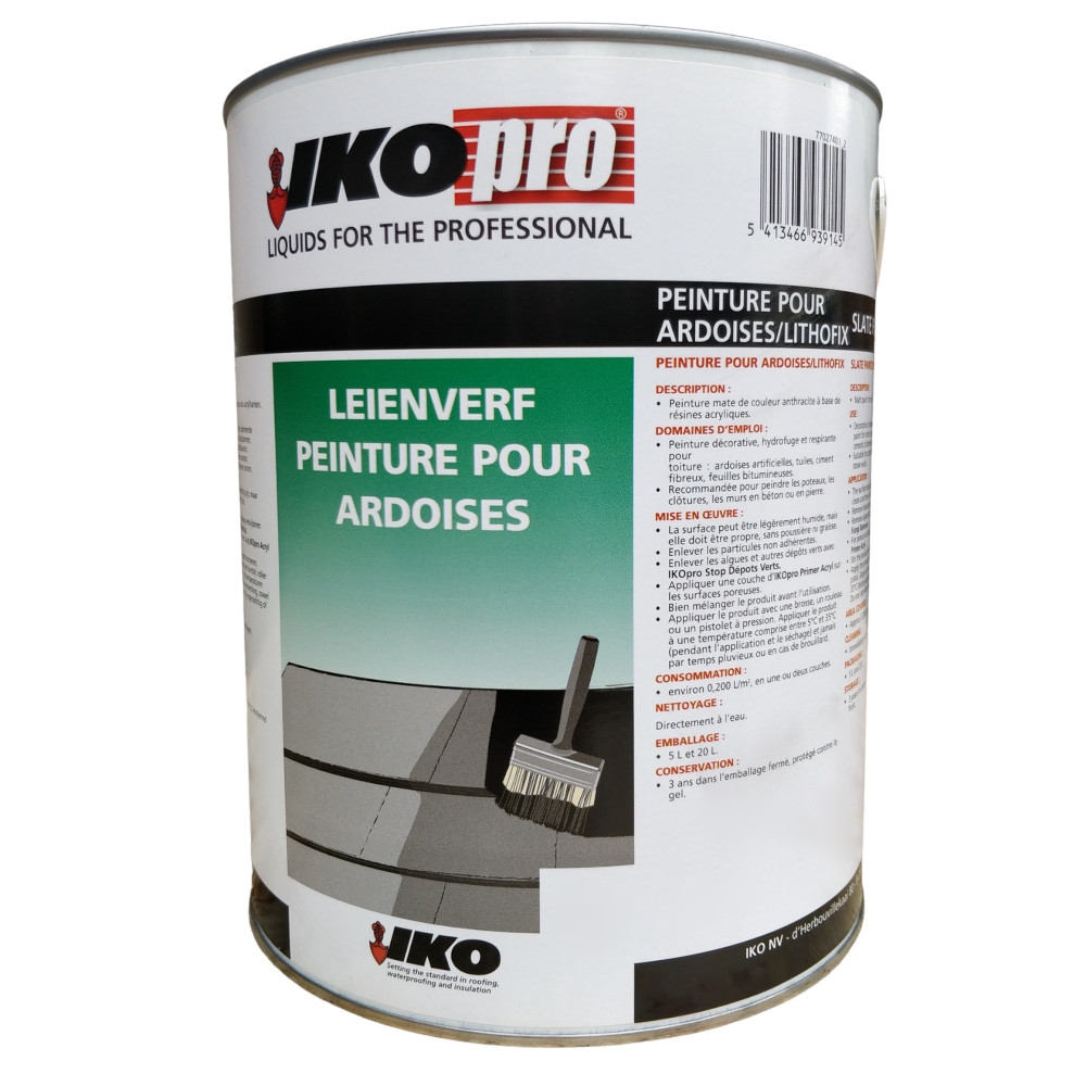 IKOpro Peinture pour ardoises 5L est une peinture noire imperméable pour ardoises synthétiques, tuiles, mâts, clôtures, murs en béton et en pierre.
