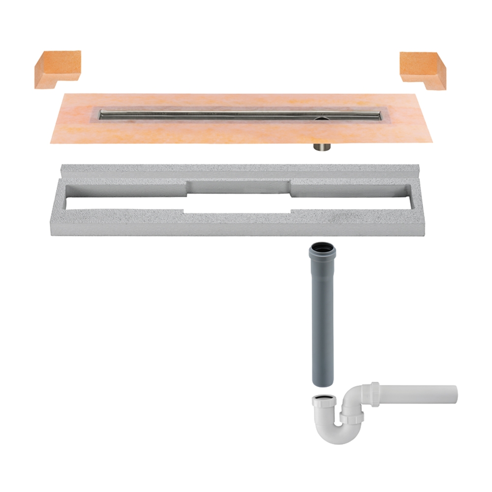 Schlüter KERDI-LINE VOS est un ensemble complet pour douches à l'italienne avec évacuation verticale et évacuation décentralisée. Il est universel pour le positionnement central ou le montage contre le mur. Sur le joint adhésif périphérique du caniveau, une manchette standard en KERDI est collée. Celle-ci assure l’étanchéité fiable du caniveau sur l'étanchéité au contact, tant sur les sols que contre les murs montants.