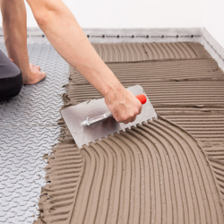 Utilisez une colle à carrelage flexible et élastique à base de ciment C2TE S1 adaptée aux sous-planchers en bois et aux tapis de déconnexion.