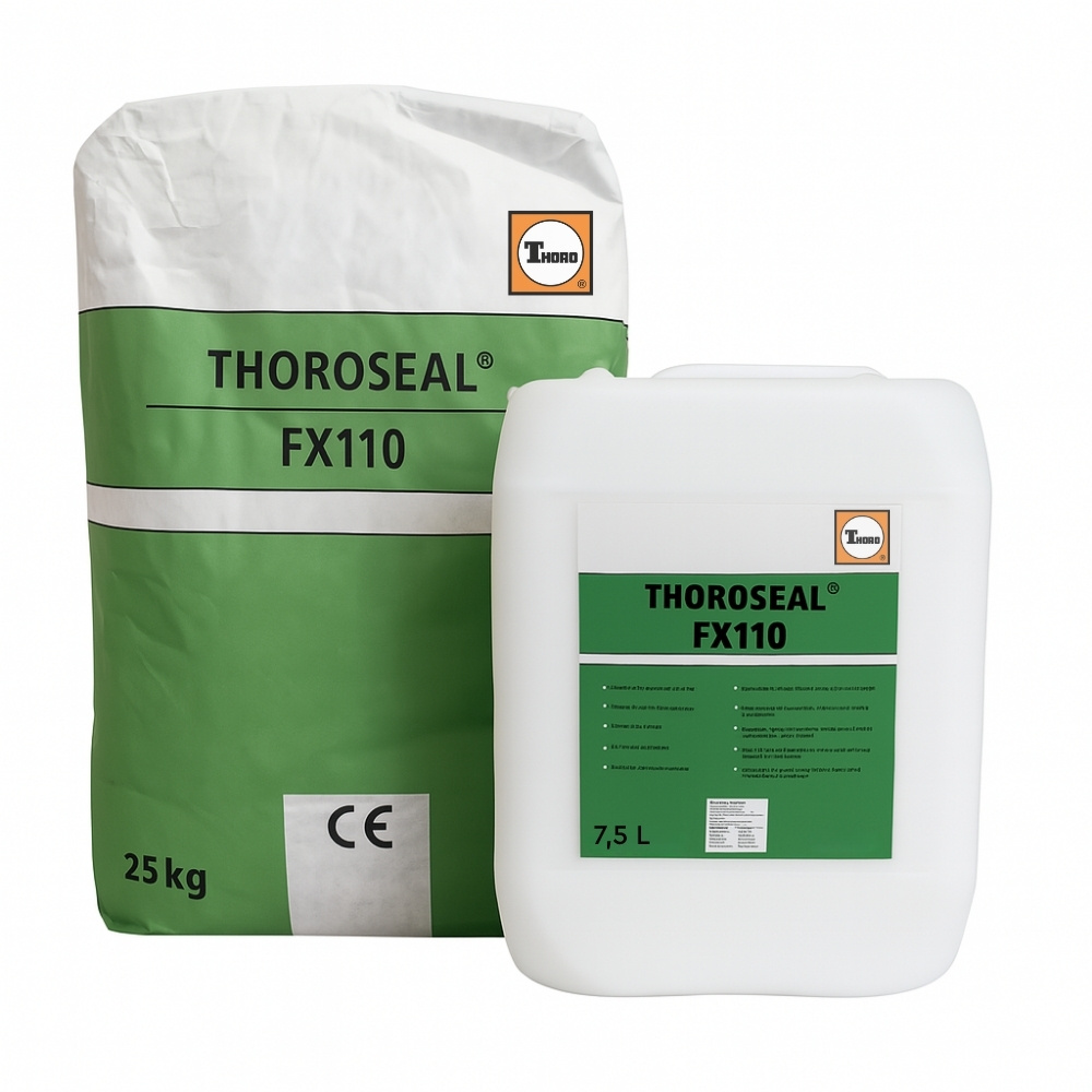 Thoroseal FX110 combine un ciment de Portland, du silice sélectionné et des additifs (Partie 1) avec une émulsion de polyacrylate (Partie 2). Après mélange, une couche élastique et résistante se forme qui passe définitivement au-dessus des fissures jusqu'à 0,3 mm et repousse la pression d'eau positive et négative. Grâce à sa structure perméable à la vapeur, le béton peut respirer tout en étant résistant aux UV et au gel/dégel.