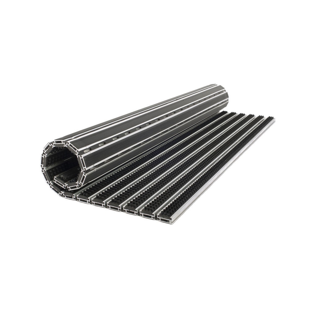 Ce tapis enroulable est composé d'un profil porteur en aluminium avec une surface de marche en brosses découpées qui ajoutent un aspect coloré à la surface. Ces brosses sont placées en rangées continues de 3 sur toute la surface de marche du tapis. Les profils en aluminium sont séparés par une bande de connexion en PVC noir de 4 mm avec des trous d’évacuation. Les profils en aluminium de couleur naturelle sont équipés sur toute leur longueur d'un profil en caoutchouc acoustique isolant.