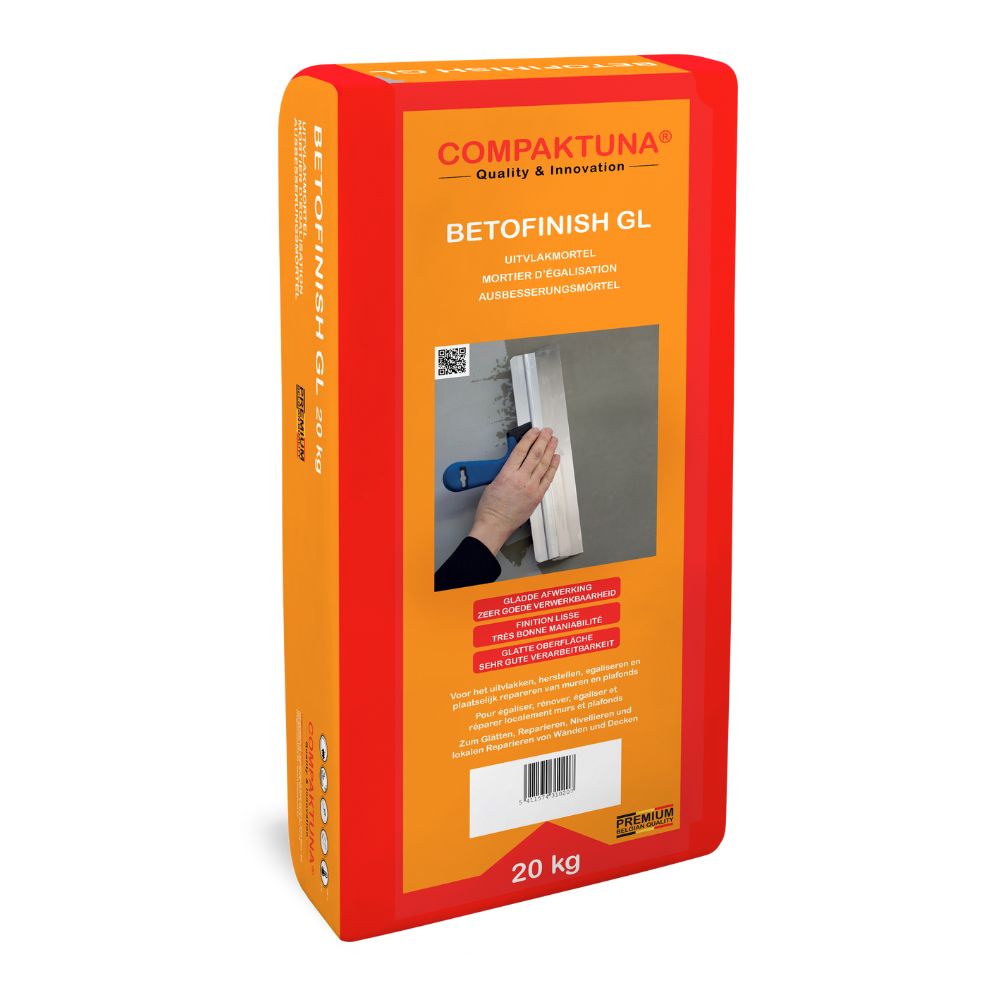 Betofinish GL van Compaktuna is een gebruiksklare poedermortel voor het egaliseren, herstellen en uitvlakken van muren en plafonds. De mortel is samengesteld uit speciaal geselecteerde cementsoorten, zand en additieven, wat zorgt voor uitstekende hechting en hoge mechanische sterkte. Bij menging met Compaktuna Pro wordt de flexibiliteit, hechting en waterdichtheid extra verhoogd, ideaal voor poreuze ondergronden of moeilijke toepassingen.
