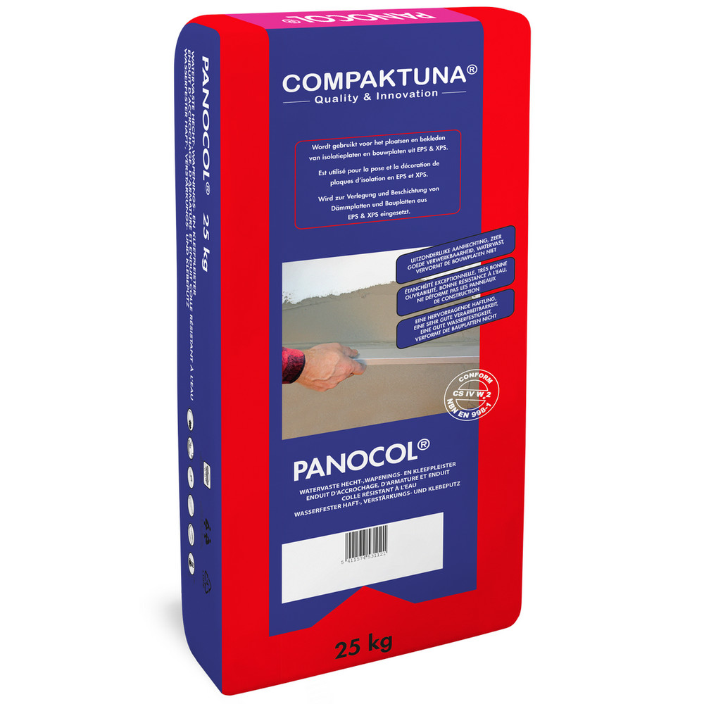 Compaktuna Panocol is speciaal ontwikkeld voor het verlijmen en bepleisteren van isolatieplaten en bouwplaten uit EPS en XPS. Dankzij de samenstelling van cement, geselecteerde kwartszanden en hoogwaardige toeslagstoffen biedt Panocol een uitstekende hechting op diverse ondergronden, waaronder baksteen, beton, gipsachtige ondergronden en prefab wanden.