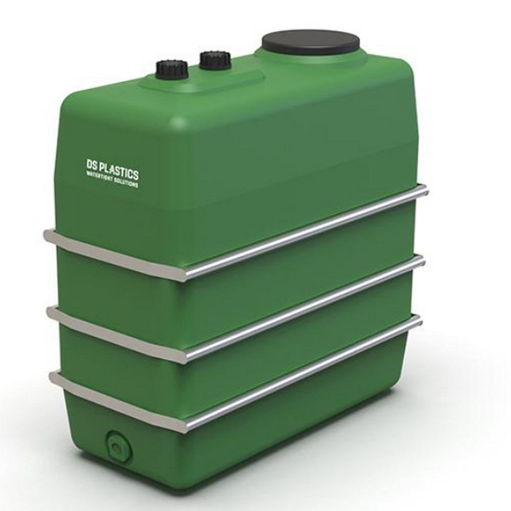 DS watertank in UV-bestendig PE-materiaal, voorzien van staalbanden om maximale stabiliteit te garanderen. Deze tank kan gebruikt worden voor opslag van regenwater.