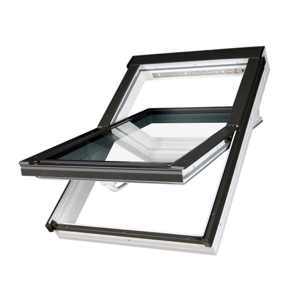 Fakro PTP-V is een tuimeldakvenster met meerkamerprofiel in wit PVC met stalen verstevigingselementen.