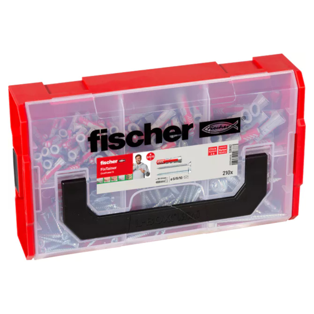 De FIXtainer bevat 3 verschillende maten aan Duopower pluggen en bijhorende schroeven. De Fischer DuoPower is een slimme plug met twee componenten en drie verschillende werkingsprincipes. Deze veelzijdige universele plug is geschikt voor bevestiging in alle soorten bouwmaterialen, waardoor tal van toepassingen mogelijk zijn met slechts één plug. De fischer DuoPower past zich automatisch aan het bouwmateriaal aan, terwijl de werkingsprincipes spreiden, tikken en knopen de zwaarste lasten gelijkmatig over het materiaal verdelen. De uitstekende respons bij het indraaien van de schroef zorgt voor extra veiligheid.