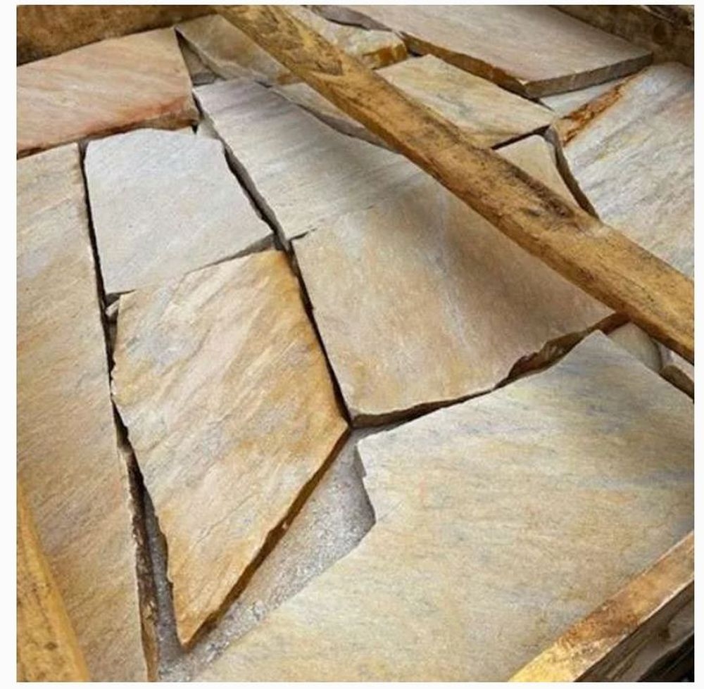 Flagstones Yellow zijn geel-beige gebroken natuurstenen met wisselende formaten. Er zitten 8 tot 12 stuks per m² en de dikte varieert van 15 tot 25 mm.