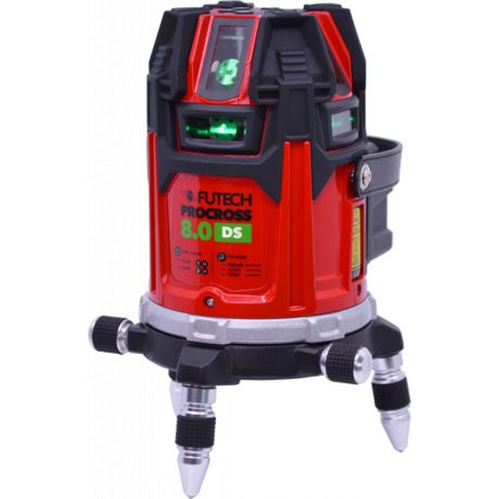 De Futech Procross kruislijnlaser 8.0 DS Groen met 4 groene horizontale en 4 verticale lijnen. Motornivellering met 1mm/10m nauwkeurigheid.