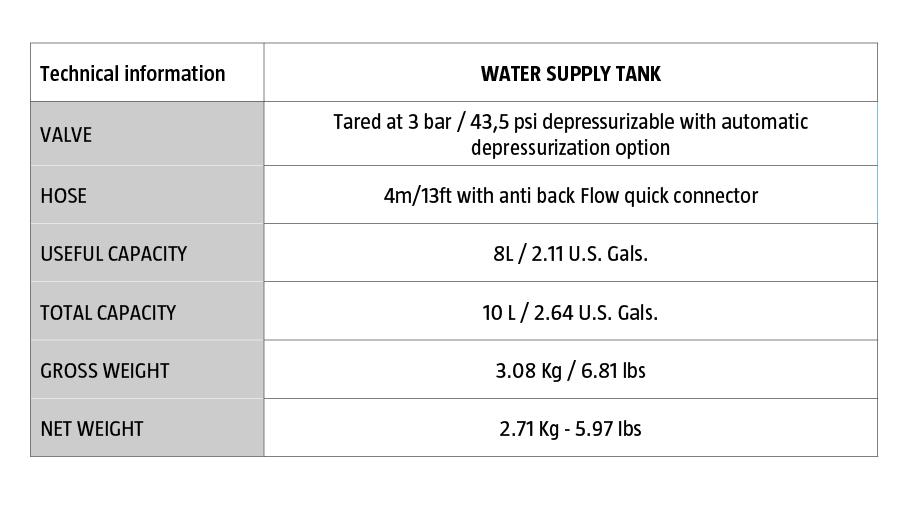 Watersupply Tank van IK is een professionele drukreservoir met wateraansluiting en heeft een capaciteit van 10 liter, ontworpen om de gebruiker de grootste weerstand, stabiliteit en gemakkelijke connectiviteit met machines met een wateraansluiting te garanderen. Het bevat een transparante slang om de vloeistofstroom goed te kunnen zien en een snelkoppeling om de slang aan draagbaar gereedschap te bevestigen.