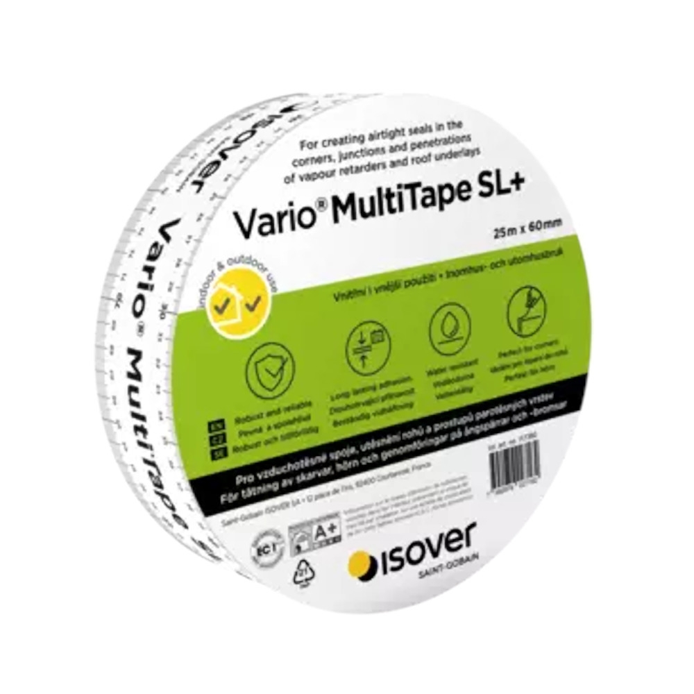 Isover Vario Multitape SL+ is een hoogwaardige luchtdichte tape die speciaal is ontwikkeld voor het afdichten van naden en kieren in isolatiesystemen. Zo is deze tape geschikt voor het bevestigen van dampschermen aan ramen, leidingen en andere onderbrekingen. De Vario Multitape SL+ verzekert de luchtdichtheid rond hoeken, doorvoeren en aansluitingen van dampschermen en onderdakfolies.