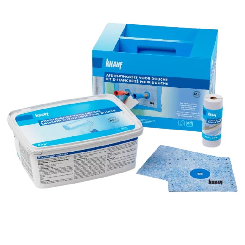 Knauf Douche-afdichtset bevat alle producten die nodig zijn voor de afdichting van doucheruimtes. De douche afdichtset zorgt voor een waterdichte en elastische bescherming van de ondergronden alvorens het aanbrengen van tegels in een vochtige omgeving