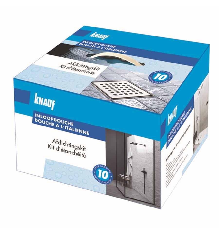 Knauf afdichtingskit voor inloopdouche bevat alle producten die nodig zijn voor de afdichting van de vloer van een privé-inloopdouche.