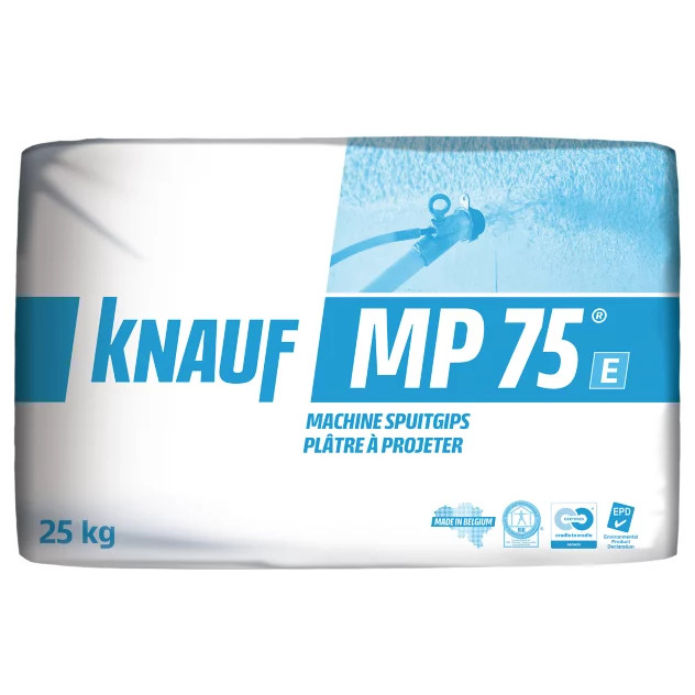 Knauf MP 75 E is een kant-en-klaar gemengd gipspleister, speciaal ontworpen voor het bepleisteren van binnenmuren en plafonds. Het product valt binnen de pleistergroep B4/50/2 conform EN 13279-1 en is gecertificeerd met ATG 1617.
