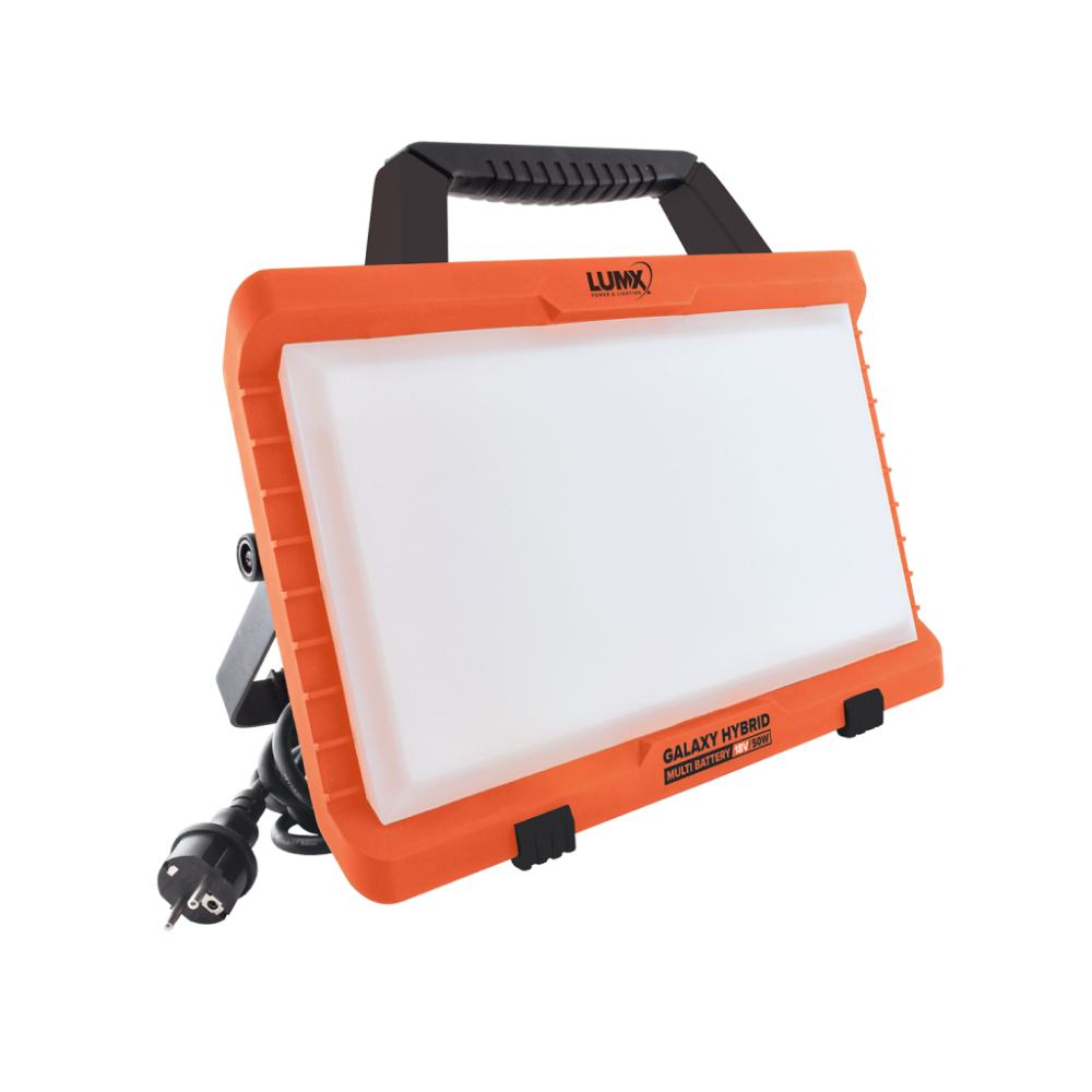 Een professionele hybride accu en kabel werflamp voor binnen en buiten van LumX. De lamp heeft een geïntegreerde weergave van de acculaadstatus, is zwenkbaar kan gebruikt worden met 18V batterijen van Bosh, Makita, Metabo, Milwaukee, Stanley, Hikoki.