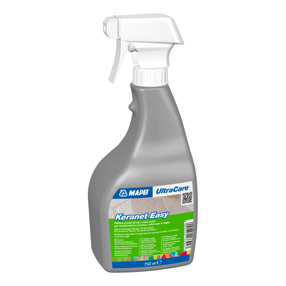 UltraCare Keranet Easy is een kant-en-klare vloeibare reiniger op basis van een speciaal organisch zuur. Het biedt de agressiviteit tegen vlekken en uitbloeiingen die vergelijkbaar is met sterkere zuren, zonder de zeer gevaarlijke, giftige dampen die die zuren kunnen ontwikkelen (gebruik wel in goed geventileerde ruimtes). Het product kan direct na het voegen worden ingezet en helpt bij grootformaat tegels het “frame-effect” te beperken. Geschikt voor het reinigen van de achterkant van tegels vóór plaatsing en tast correct gebruikt de voeg (ook gekleurd) niet aan.