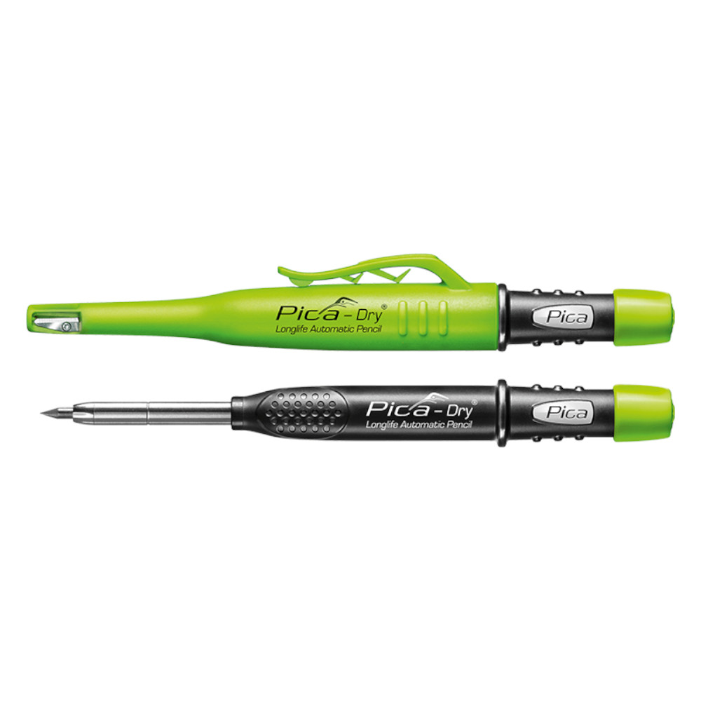 Het PICA DRY Markeerpotlood is een potloodstift met vaste vulling, waarbij de vulling automatisch naar buiten schuift. De stift heeft een grote huls met een geïntegreerde slijper, ideaal voor markeringen op alle materialen, zelfs op uitdagende oppervlakken zoals stoffige, ruwe, olieachtige, vochtige, donkere en met silicone bedekte oppervlakken.