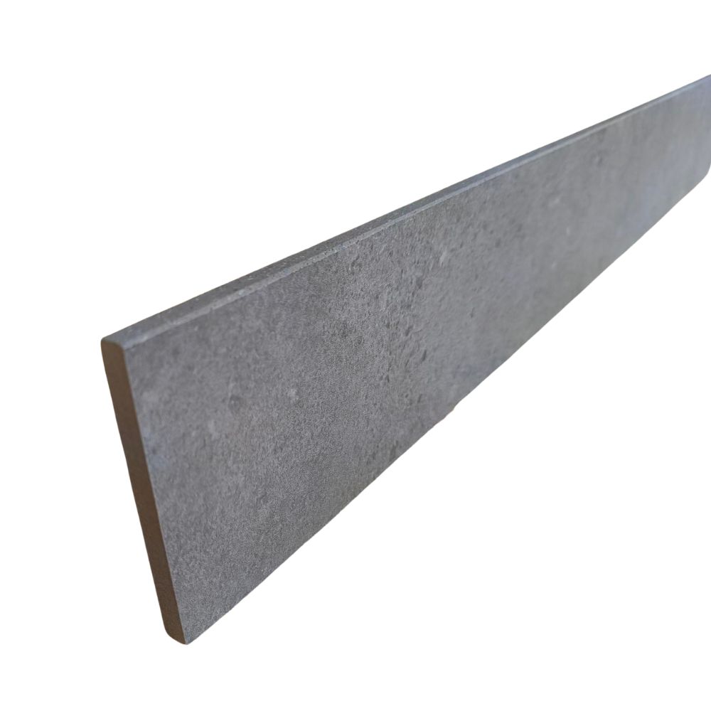 Grijze keramische plinten van 60 x 8 x 0,8 cm met rechte bovenzijde.