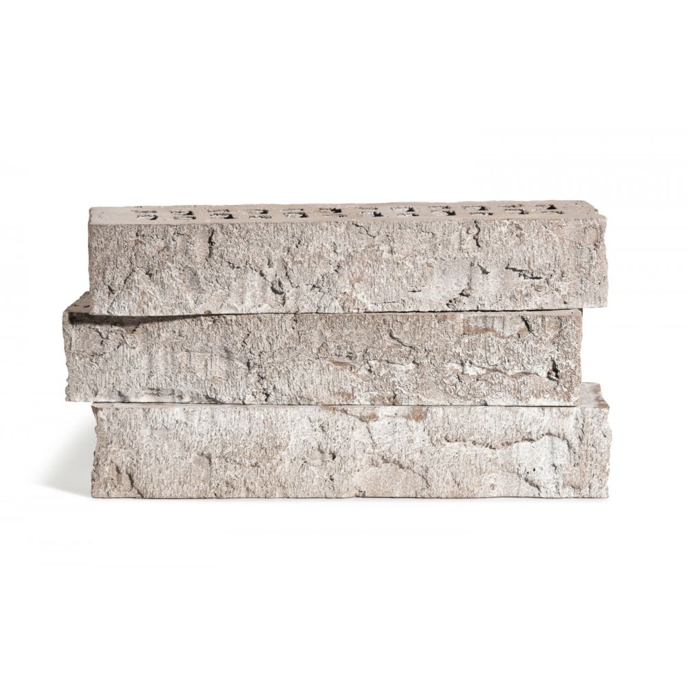 Deze geperforeerde mechanische gevelsteen heeft een ruwe rotstextuur en is gemaakt op basis van brunssumse klei.