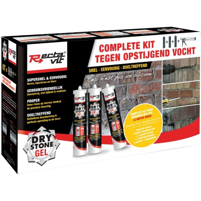 Rectavit DryStone Gel Combibox is een gebruiksklaar en solventvrij injectiesysteem voor het blokkeren van opstijgend vocht in de muur.