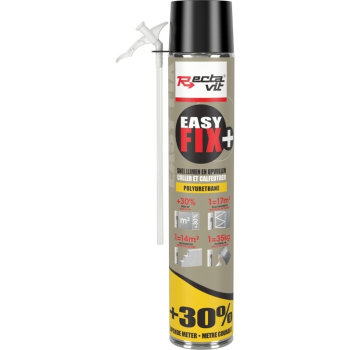 Rectavit Easy Fix 17m² 870ml is een sneldrogende 1-component polyurethaan montagelijm voor verlijmingen in de droogbouw. Ideaal voor het verlijmen van isolatieplaten, gipsplaten, cellenbeton en andere bouwmaterialen.