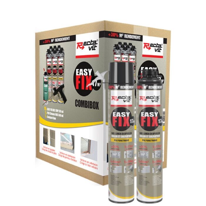 Rectavit Easy Fix 17m² NBS is een sneldrogende 1-component polyurethaan montagelijm voor verlijmingen in de droogbouw. Ideaal voor het verlijmen van isolatieplaten, gipsplaten, cellenbeton en andere bouwmaterialen. Nu met meer rendement: Tot 17m² verlijming per bus!
