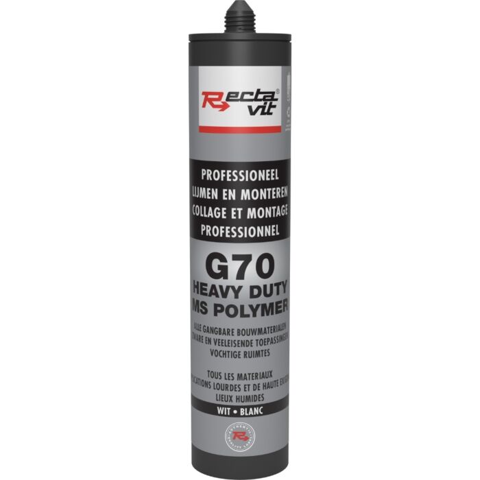 Rectavit G70 Heavy Duty is een professionele supersterke, snelle, elastische montagelijm met nog hogere aanvangshechting (Heavy Duty) op basis van MS polymeren, voor het lijmen en monteren op alle gangbare bouwmaterialen.