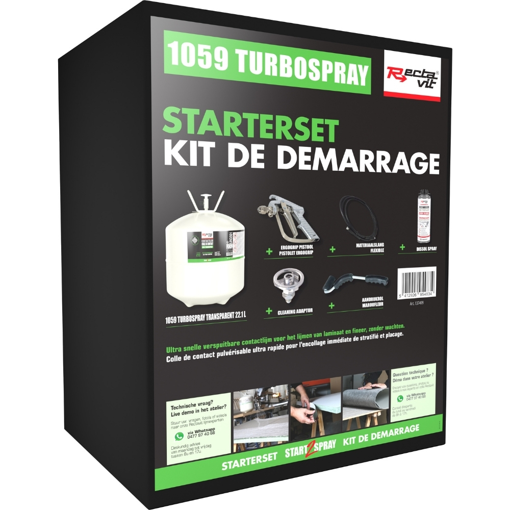 Start 2 Spray TurboSpray 1059 is een compleet startpakket waarmee je aan de slag kan met het Rectavit NeoSpray systeem. De verspuitbare contactlijm met extra korte afdamptijd in een draagbaar canister wordt gebruikt voor het snel verlijmen van laminaat en fineer (linoleum, leder, kurk, rubber) op poreuze ondergronden.