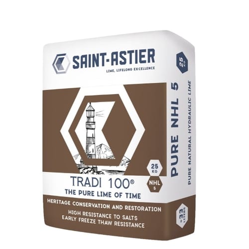 De natuurlijke hydraulische kalk NHL 5 van Saint-Astier®, CHAUX PURE TRADI 100, wordt vervaardigd door het branden en blussen van uitzonderlijke krijt- en silicahoudende kalksteen zonder toevoegingen. CHAUX PURE TRADI 100 biedt een combinatie van luchthardende en hydraulische eigenschappen, waardoor het ideaal is voor het bereiden van mortels en beton. Dankzij kenmerken als plasticiteit en dampdoorlaatbaarheid is het bijzonder geschikt voor de restauratie van gebouwen zonder het gebruik van cement.