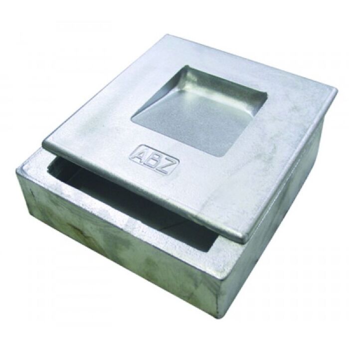 Een schouwkast in aluminium om het roet op te vangen dat bij het reinigen van de schoorsteen beneden valt.