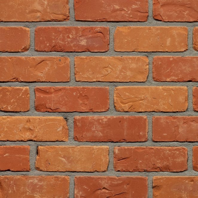 Wienerberger Boomse Recup is een genuanceerde geperste steen in rode - oranje massakleur met hier en daar wat paarsrode en donkeroranje reductievlekken.