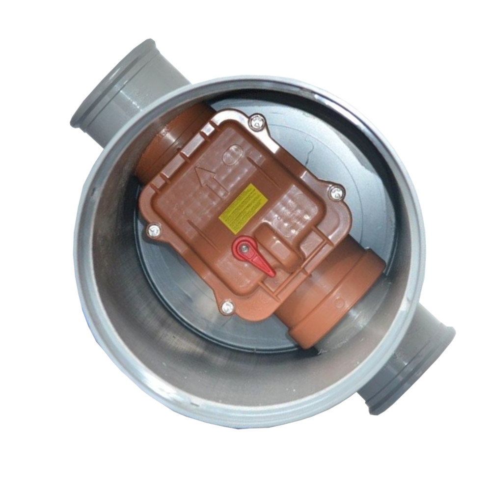Een terugslagklep met doorvoer diameter 125 mm, ingewerkt in een ronde PVC put met diameter 400 mm, voor bescherming tegen teruglopend rioolwater. Inclusief vergrendel functie.