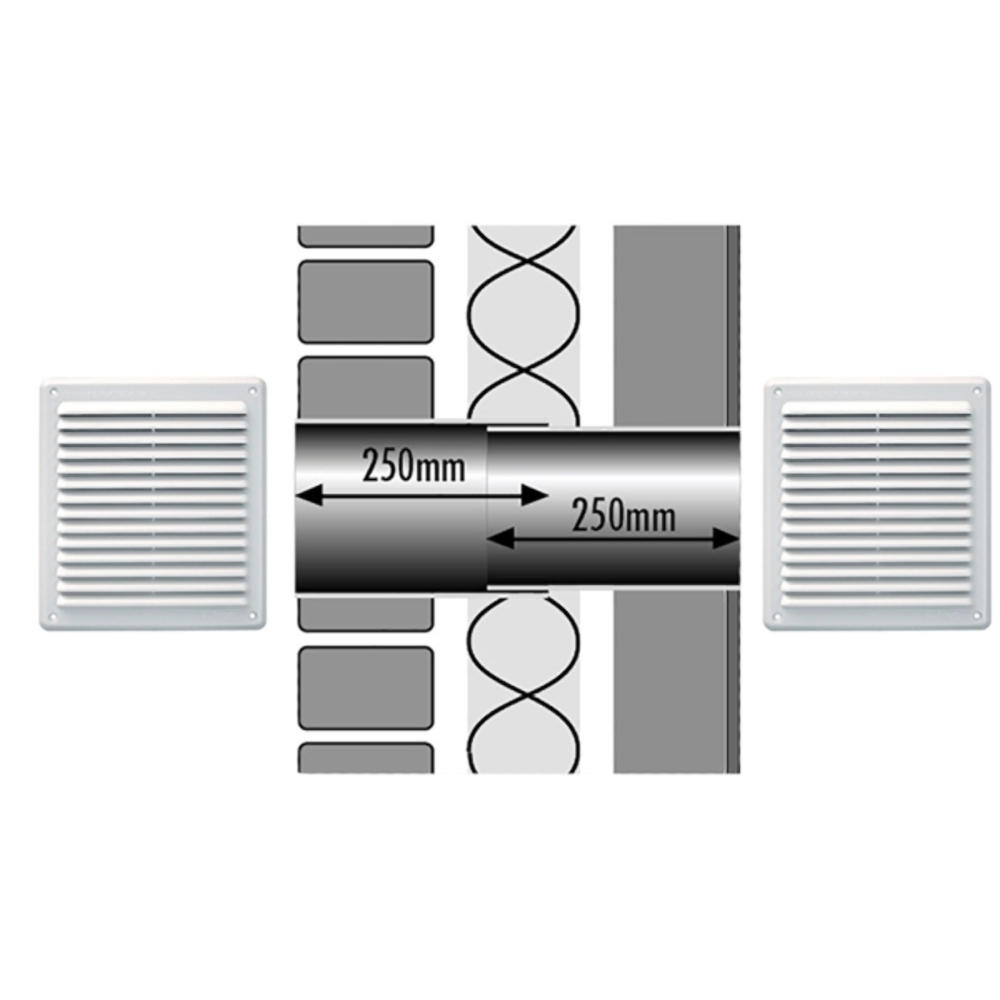 Dit is een middelgrote muurdoorvoerset die bestaat uit een buitenrooster, een telescopische muurdoorvoerbuis en een afsluitbaar binnenrooster. Dit systeem is ideaal voor extra ventilatie in een ruimte te creëren.