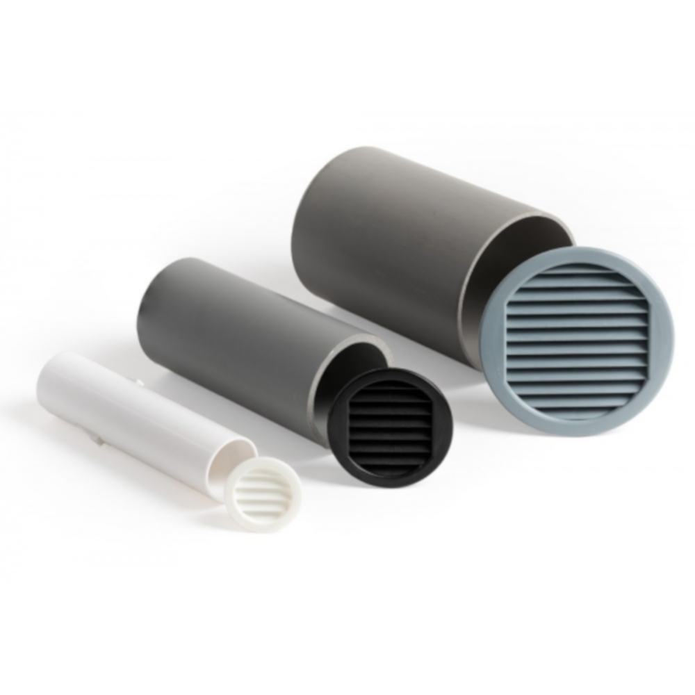 - De muurbuis is beschikbaar in drie verschillende formaten: Ø 30mm - Ø 50mm - Ø 80mm (buitenmaat rooster)