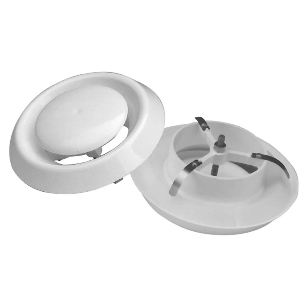 Kunststof ventilatieventiel voor toe- en afvoerlucht, van wit polypropyleen. Dit ventiel is geschikt voor kanaalmontage met afdichtingsring van schuim.