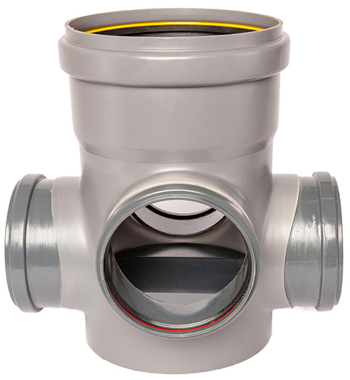 Een PVC toezichtput met diameter Ø250 mm en 4 x 160 mm doorvoeren.